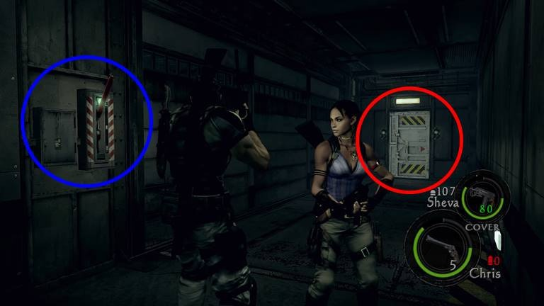 この通路を通る際は歩いて移動し、ドアもゆっくりと開けるようにしましょう(ドアを開ける際、ボタンを連打してしまうとクリスが蹴って開けてしまうので注意しましょう)