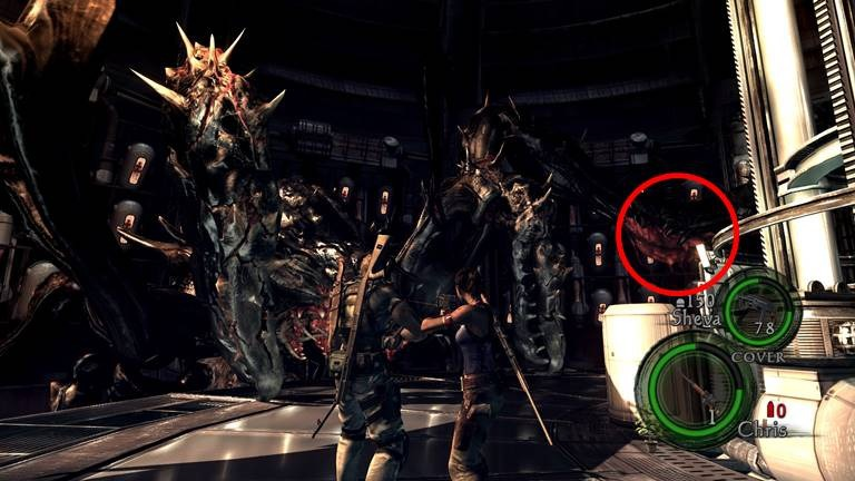 途中U-8がステージの上部に登ると小さなB.O.W.を9体出現させるのでショットガンなどを使って倒しましょう(倒すと弾や手榴弾を落とします)