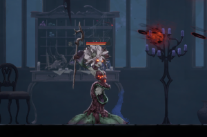 途中の雑魚を倒す→左上にジャンプ→肉腫の床破壊→上→壺に向かってジャンプ→先を下に降りる。