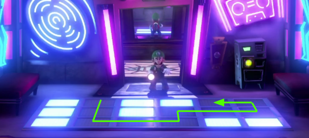 入ってすぐ、ランプが消えている部分の床パネルを一筆書きの要領で歩いていく。