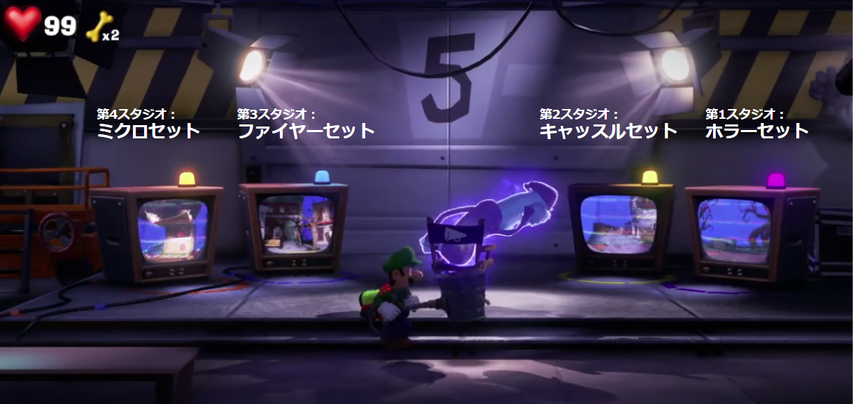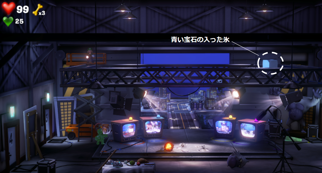 まずは、バックステージ(中央の監督がいる部屋)で、天井のレールから落とした氷を吸い込んだ状態でファイヤーセットの映ったテレビ(左から2番目)を調べると、氷を持ったまま第3スタジオに入れる。