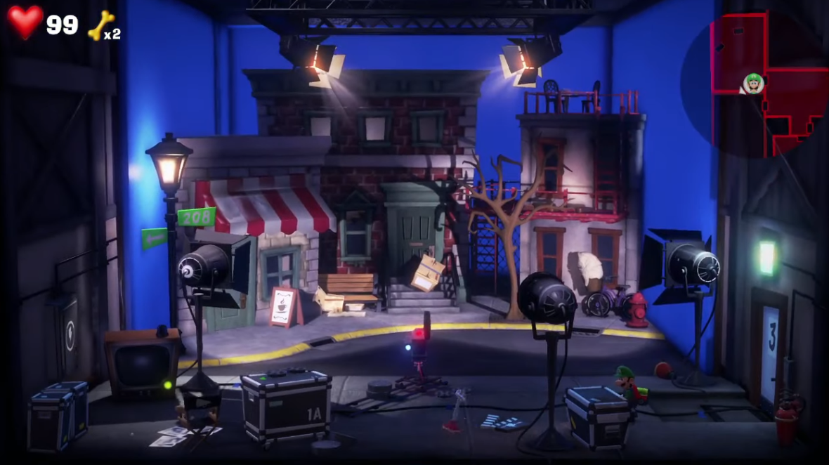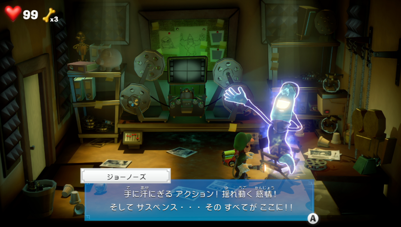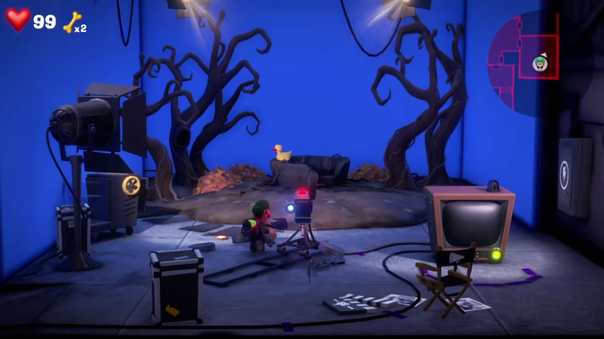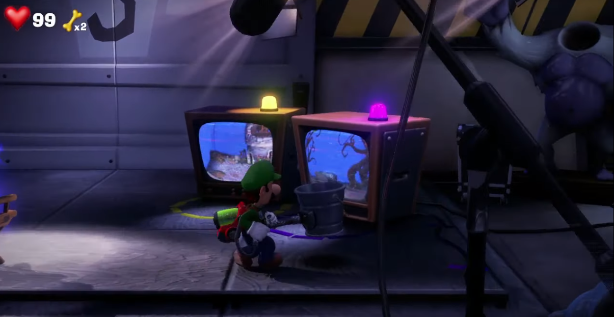 バックステージ(中央)にあるバケツを吸い込んで、「ホラーセット」(一番右のテレビ)を調べ、第1スタジオに行く。