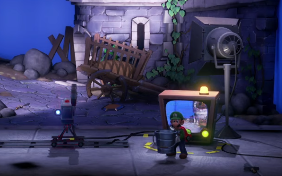 バケツを持ってキャッスルセットへバケツをグーイージに持ち替え、ルイージはカメラを覗く